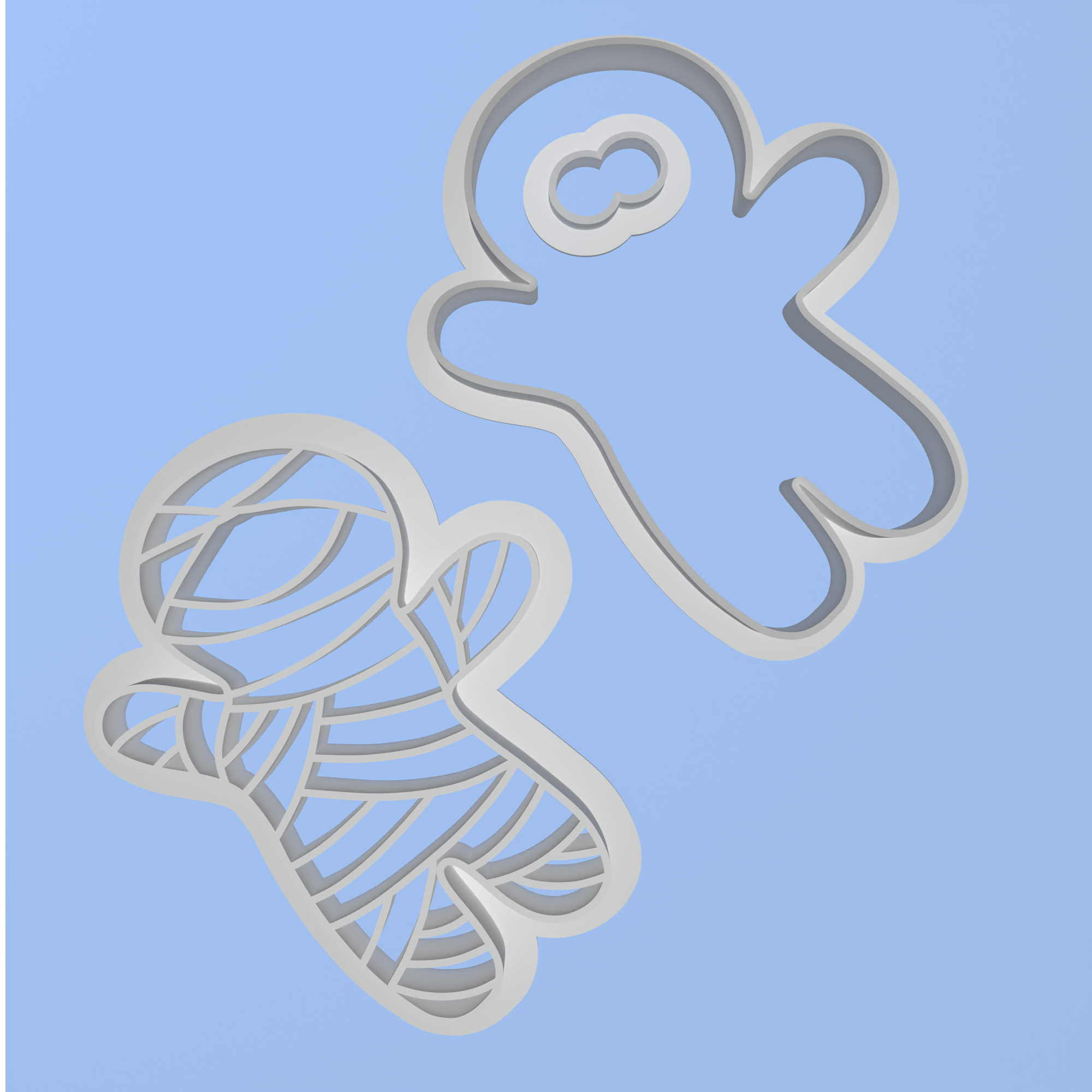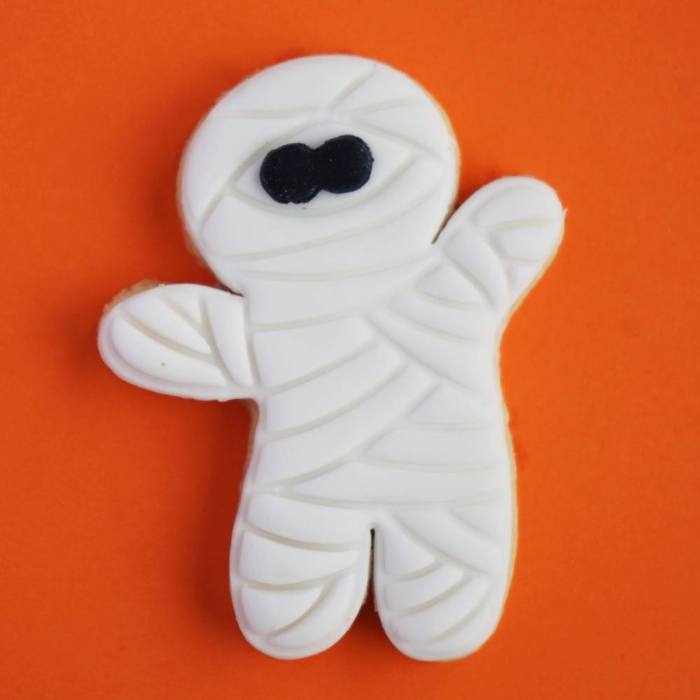 Kakform i form av en mumie – perfekt till Halloween! Setet innehåller en utskärare för själva kakan, en stämpel för detaljer samt en separat utskärare för ögonen, så att du enkelt kan skapa roliga och detaljerade mumiekakor.