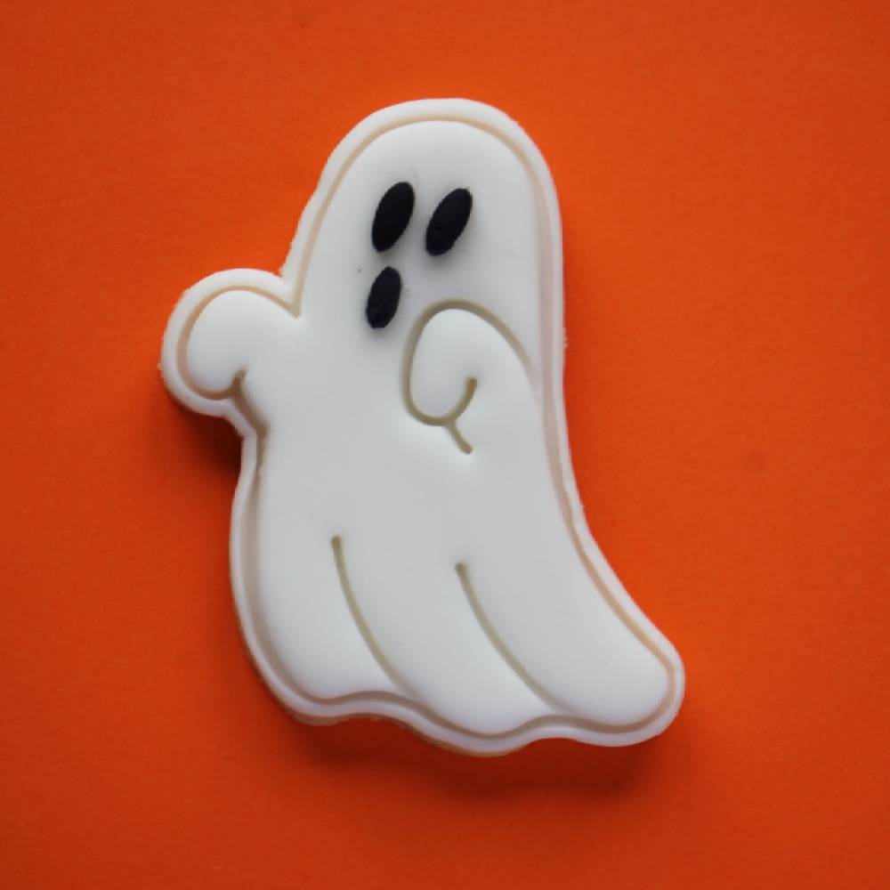 Kakform i form av ett skrämt spöke – perfekt till Halloween! Innehåller en utskärare för själva kakan, en stämpel för detaljer samt separata utskärare för ögon och mun, så att du enkelt kan skapa uttrycksfulla och detaljrika spökkakor.